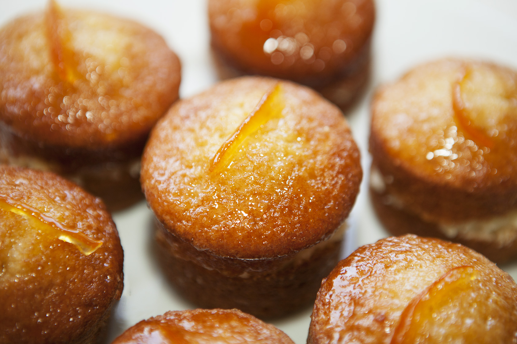- Once completely cooled cut the mini cakes in half down the middle widthways and fill with a teaspoon of butter cream and a little marmalade. Sandwich the cakes together then top with marmalade and a piece of orange rind. As seen in the picture.