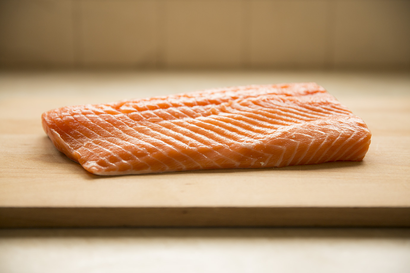 2. Lay the piece of salmon onto a chopping board. Using a very sharp knife carefully slice thin pieces and place in a deep serving dish. Continue to do this until all of your salmon has gone. Throw away the skin.