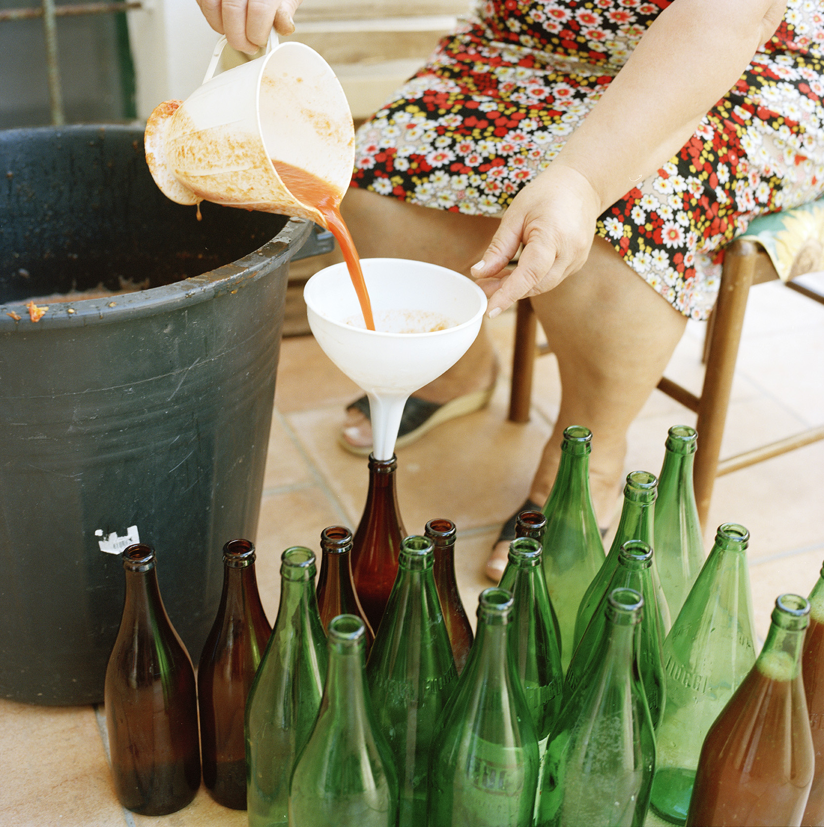 The sauce is bottled and stored in a cool dark place to last the coming year.