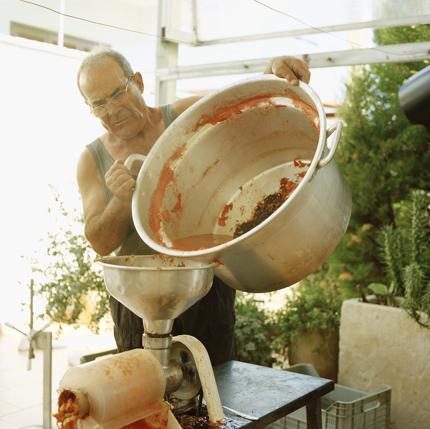 - Being careful not to burn yourself, use a jug to pour the cooked tomatoes in the Mouli in small amounts and puree the tomatoes. Discard the skin and pulp.