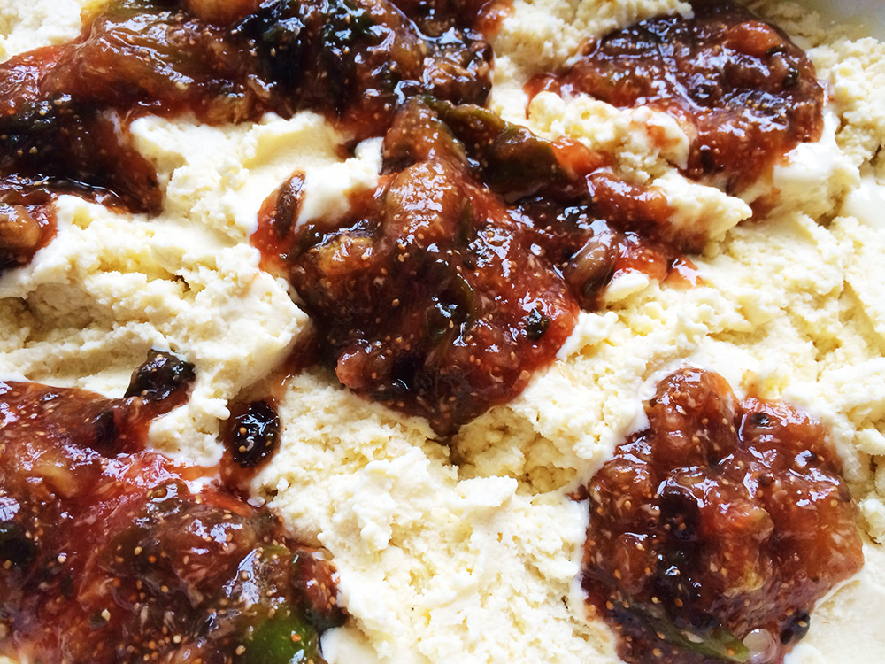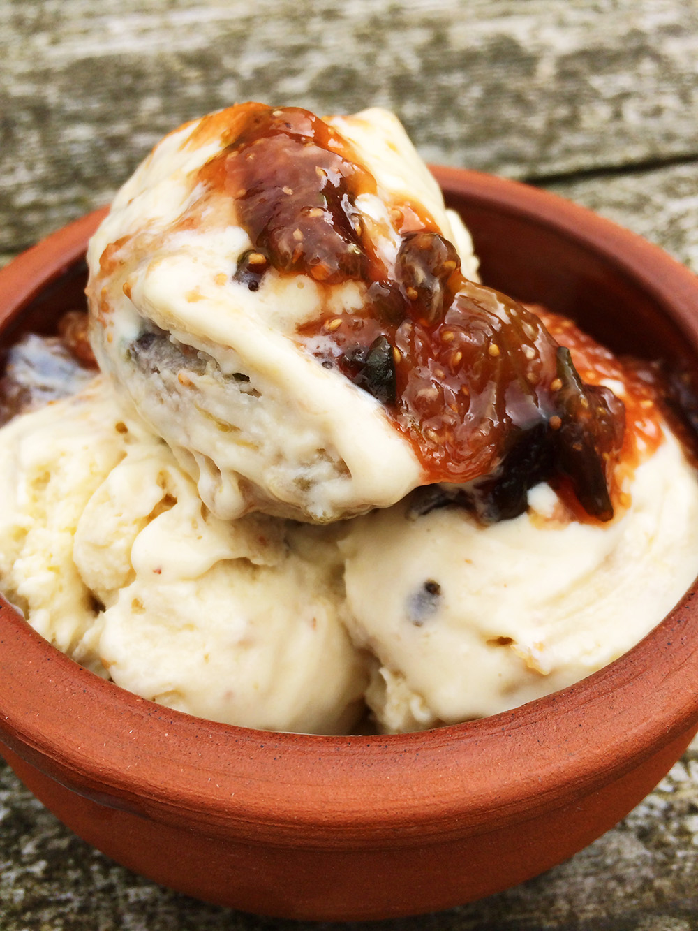 - While your gelato is churning, make the fig ripple. Crush the ripe figs into a pan along with a teaspoon of sugar and cook on a low heat until they become a jam like paste. Allow to cool.