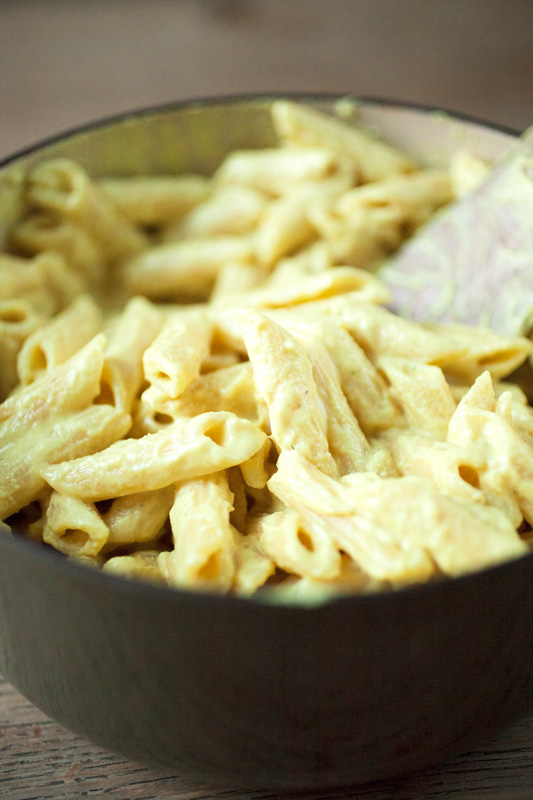 3. When the pasta has cooked drain it and put it back into the pan. Add the creamy yellow sauce and stir with the pasta for 5 minutes until thickened.