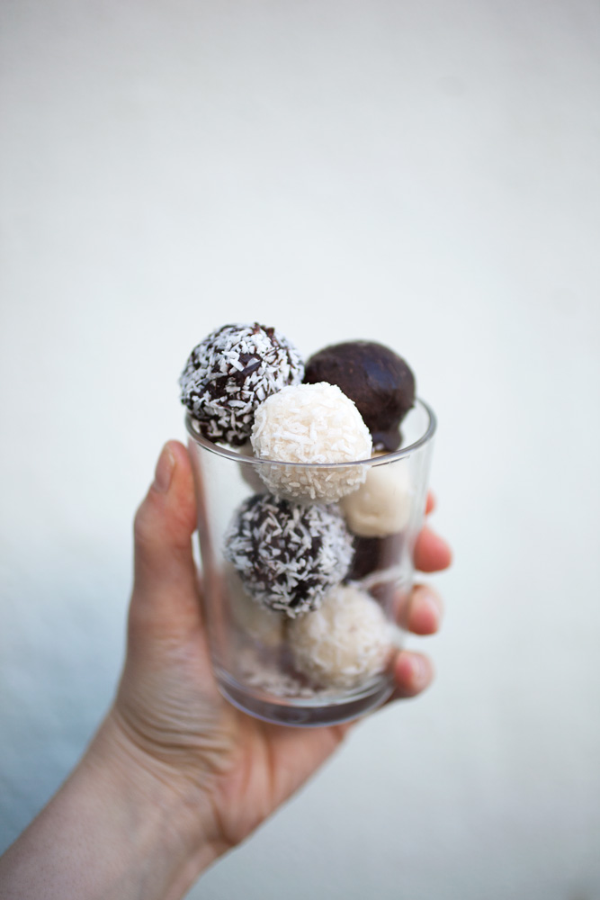 - Decorate the balls as follows – dip some in the melted chocolate – roll a few chocolate dipped balls in desiccated coconut – keep some plain – roll plain balls in desiccated coconut.
