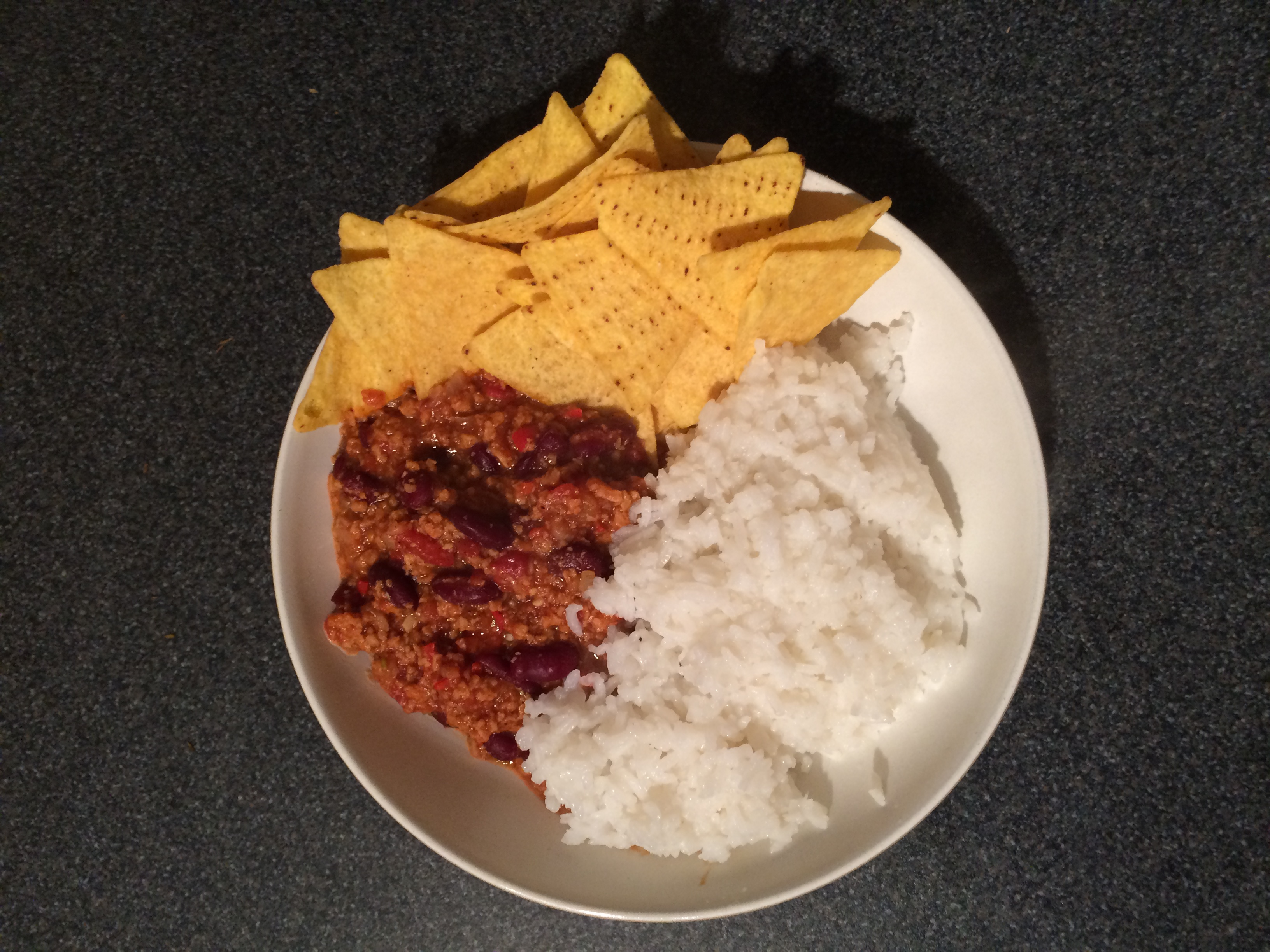 Dinner: Vegan chilli with rice and tortillas