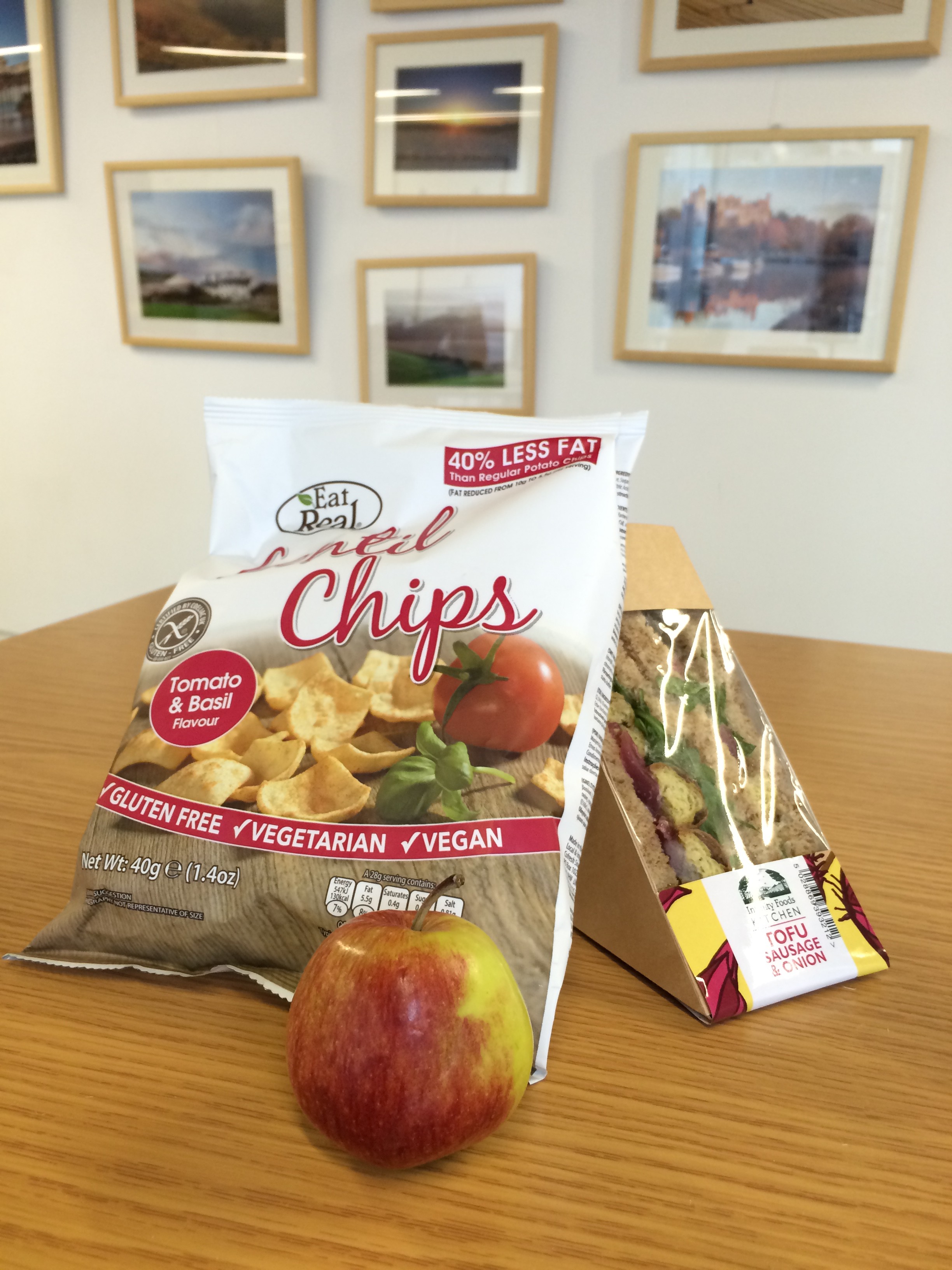 Lunch: Tofu sandwich with paprika and soy sauce Infinity Foods tofu sausage and onion sandwich, lentil crisps and an apple