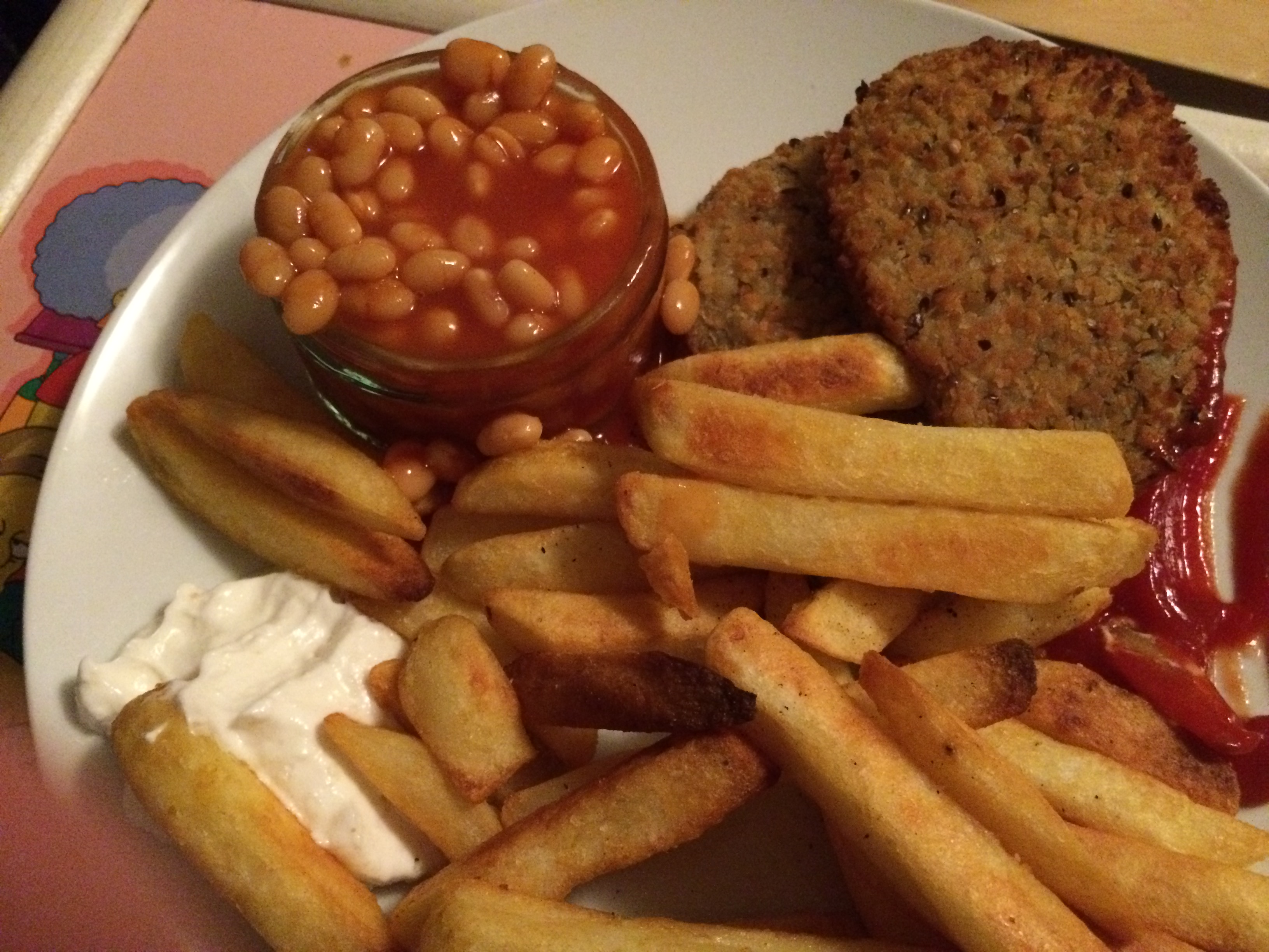 Dinner: Frys flaxseed and soybean Schnitzels, chips and beans