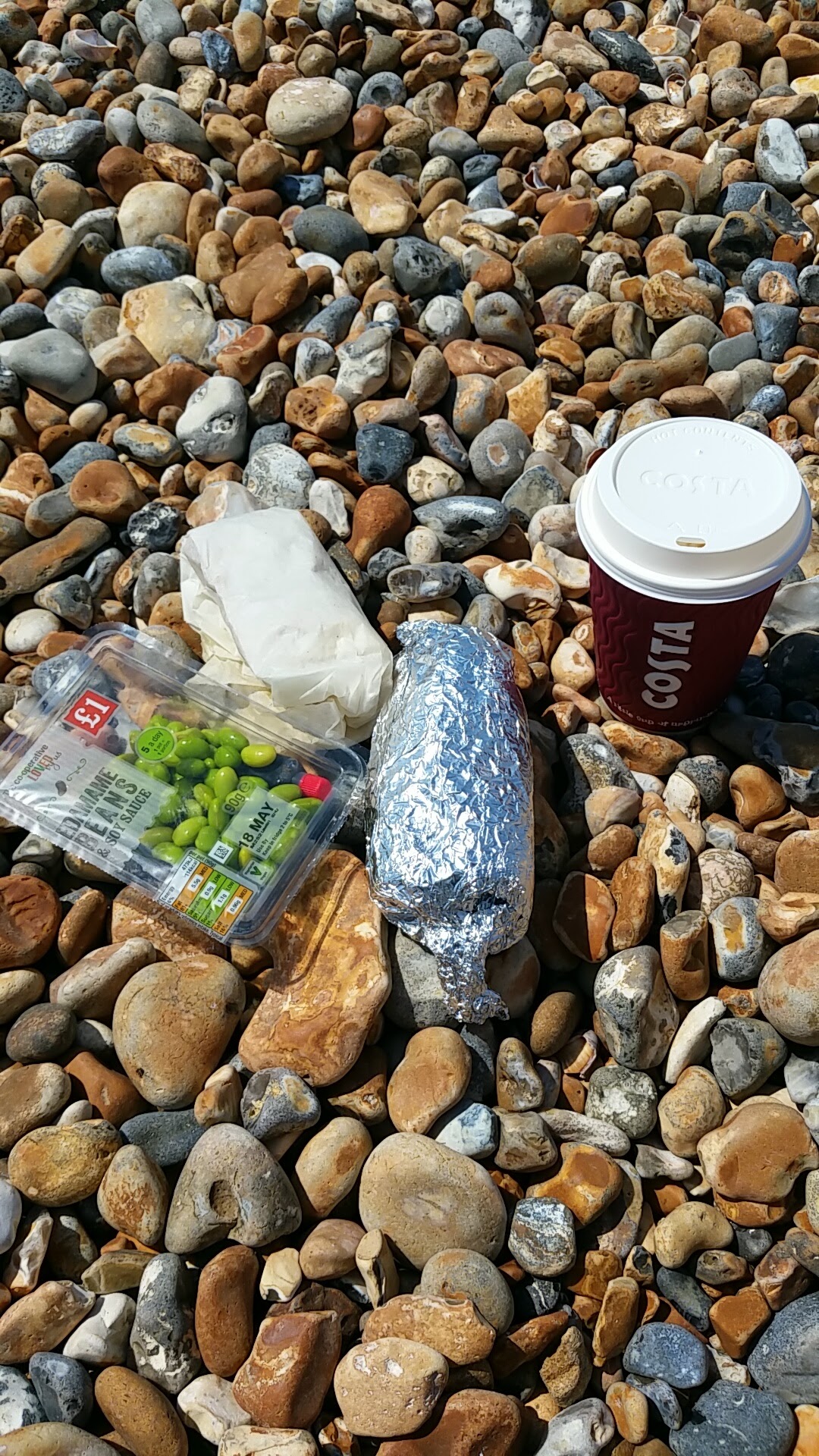 Lunch: Homemade wrap with homemade bean patties, salad (lettuce, onion, cucumber), and broccoli. Edamame beans with soy sauce, soy latte from Costa