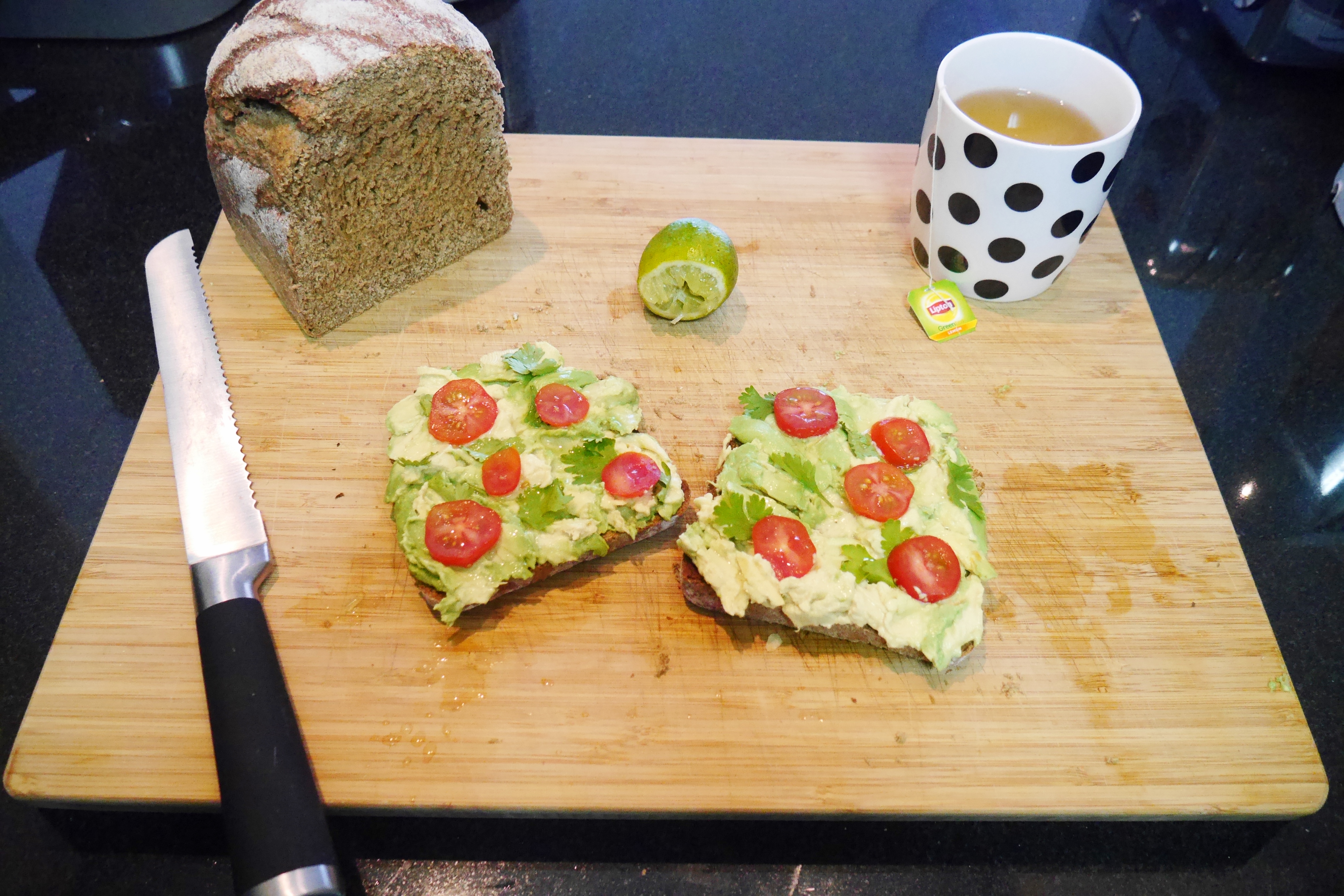 Breakfast: Avocado, cherry toms and lime juice on rye bread, and a green tea