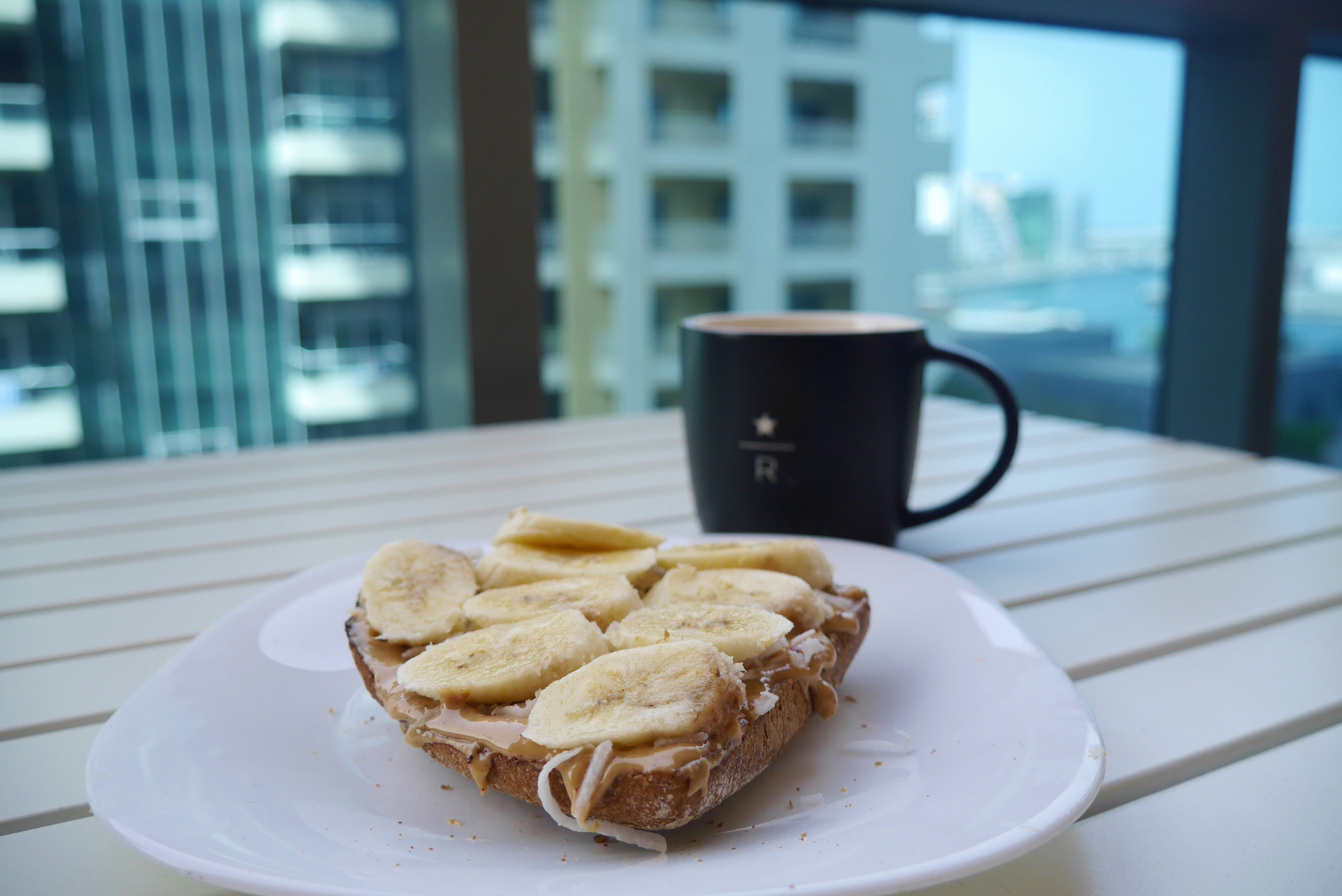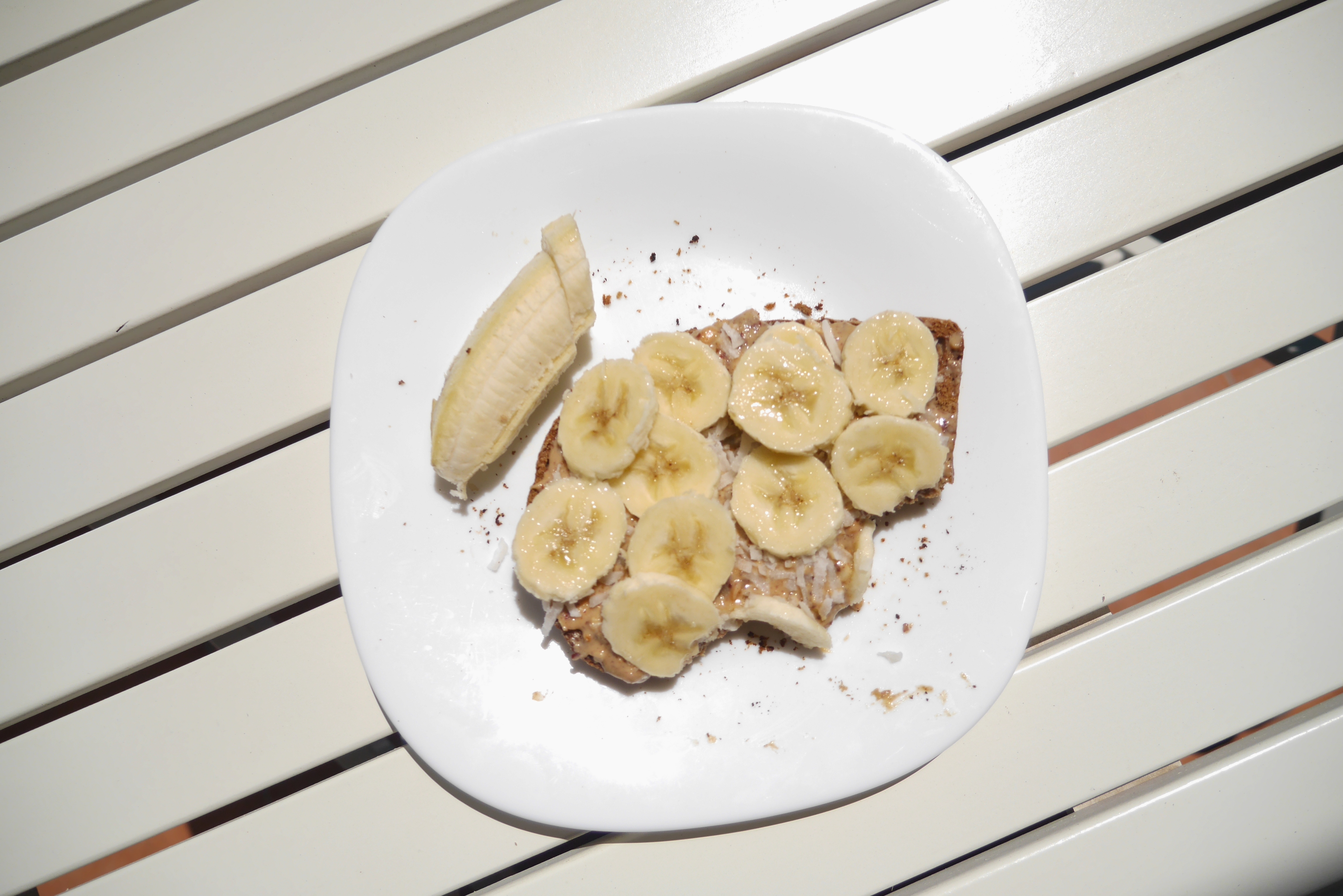 Breakfast: Peanut butter, coconut flakes and banana on rye bread toast. It’s so good