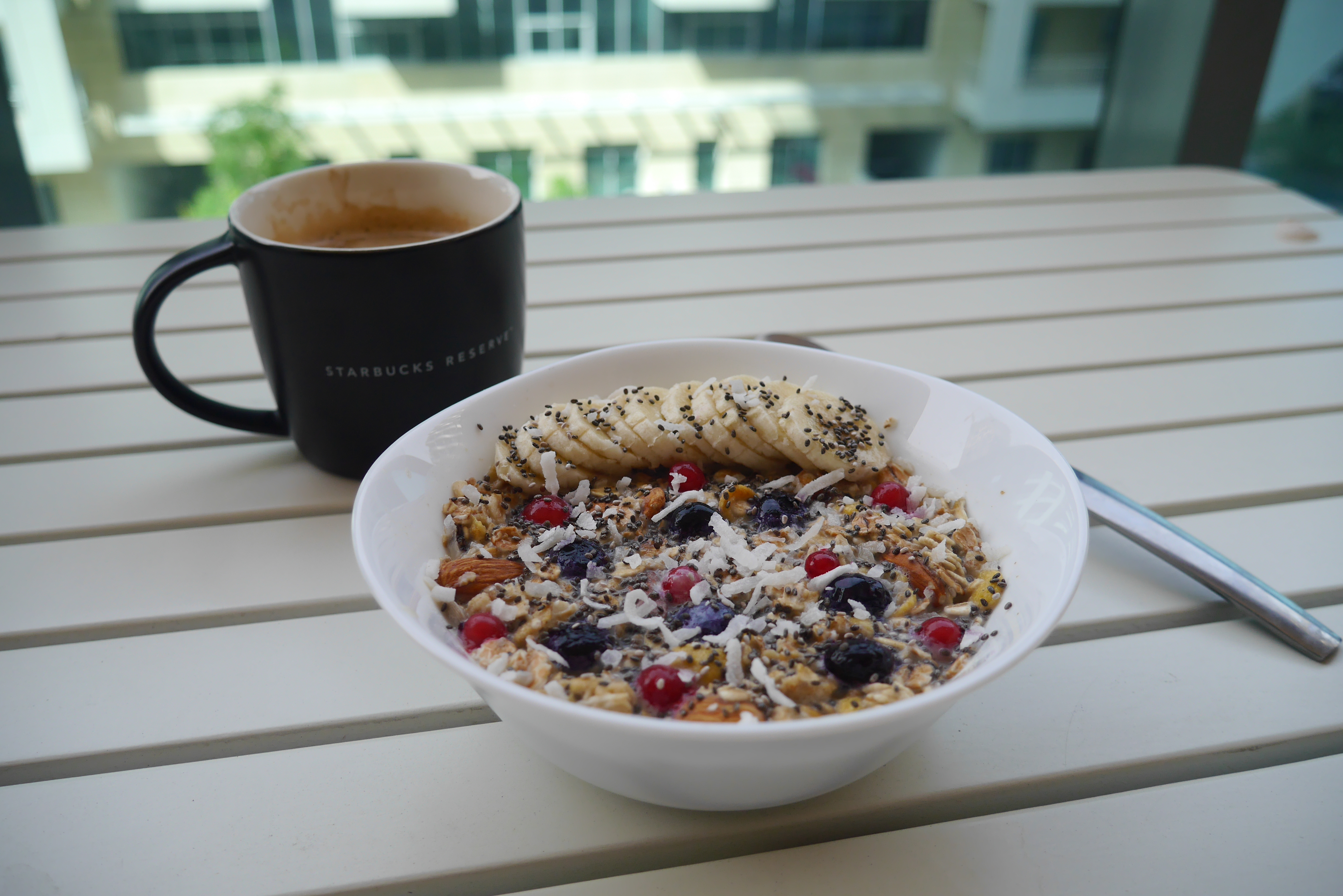Breakfast: Oats, almonds, berries, chia and flax seeds, coconut flakes, soy milk and a coffee