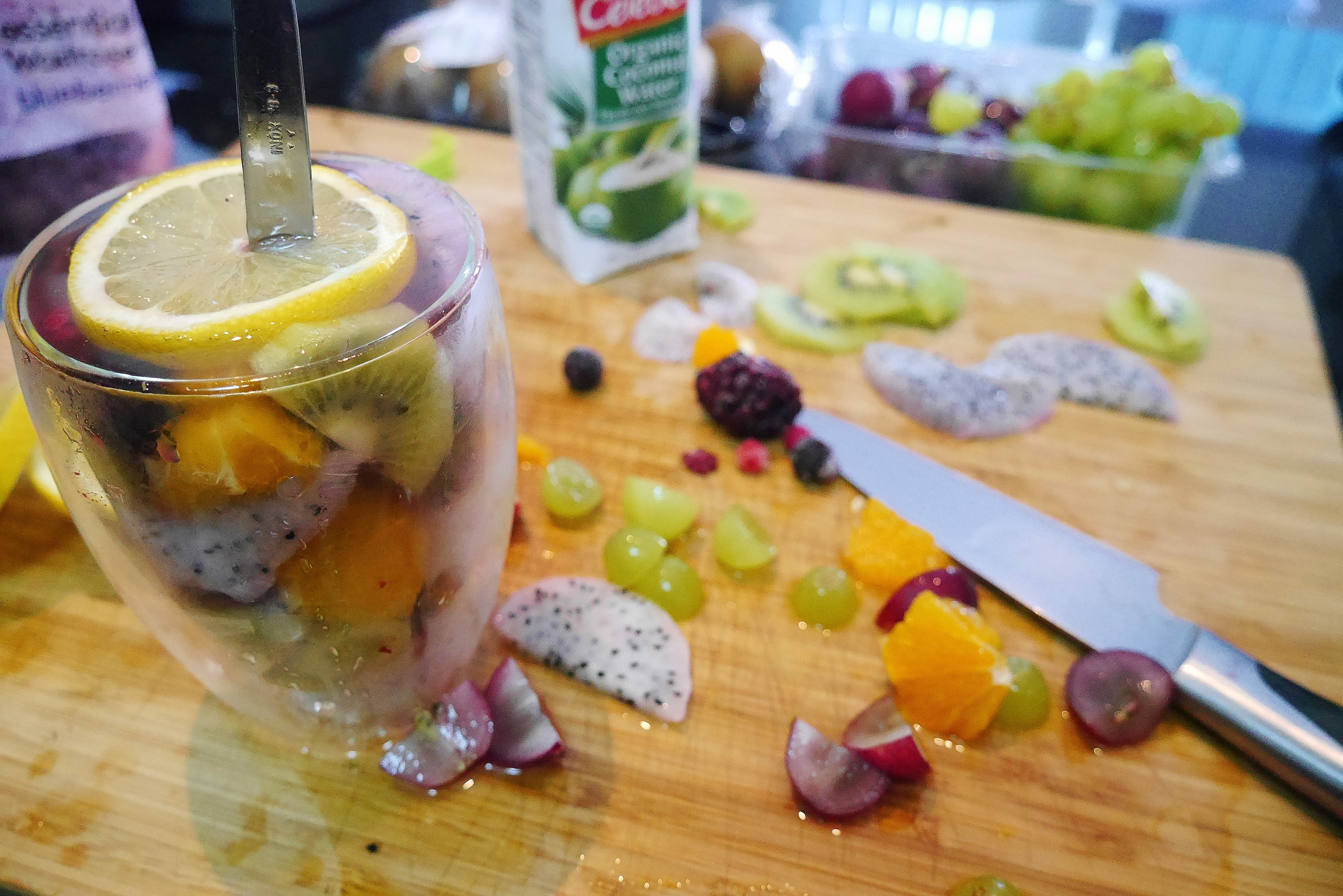Snacks: Mixed berries, kiwi, banana and coconut water smoothie. Baked almond feta with pitta. ACV drink and green tea