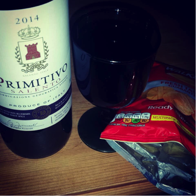 Snacks: Half a bottle of red wine and packet of ready salted Walkers whilst watching a film.