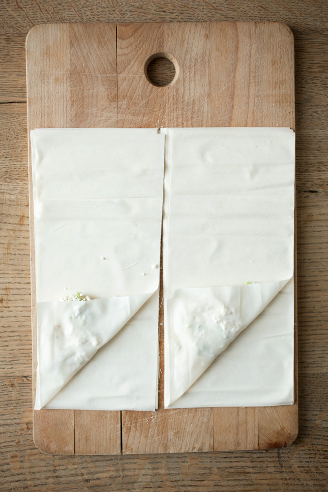 - Place a tablespoon of feta on the bottom right hand side of the pastry. Place your hand underneath the pastry and feta then fold upwards to create a triangle. Repeat until the pastry strip ends. Place on a plate ready to be fried.